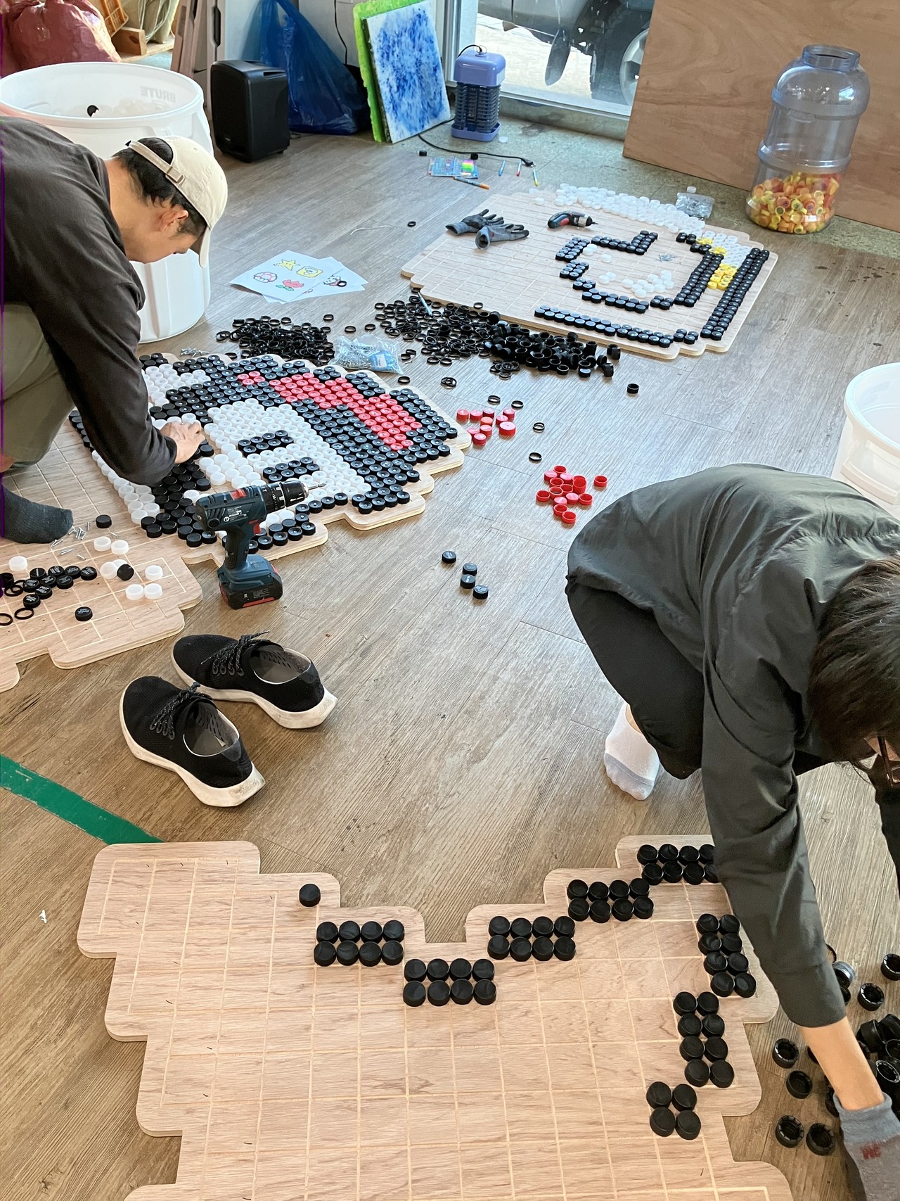 도안에 보며 병뚜껑을 나무판 위에 맞춰 나갔습니다.